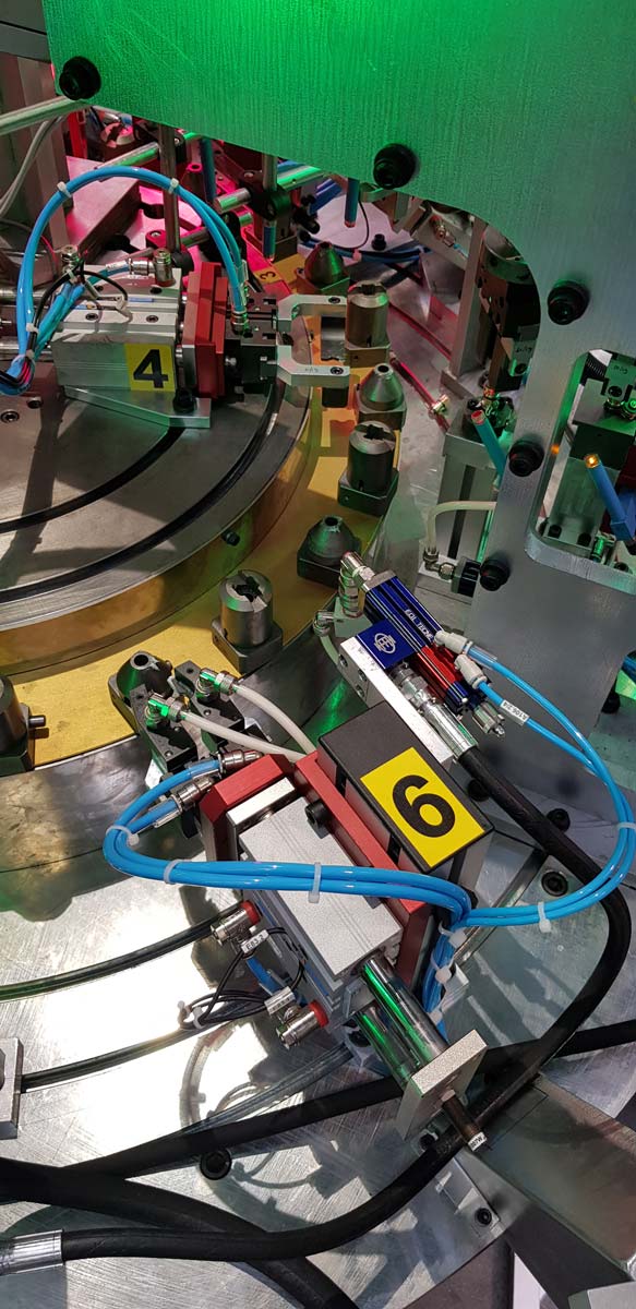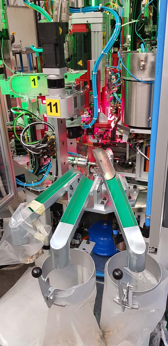 Tutte le fasi di assemblaggio dispongono di sistemi di visione tramite telecamera per il controllo di corretto montaggio. Lo scarico è automatico con selezione buoni e discriminazione tipologia di scarti.