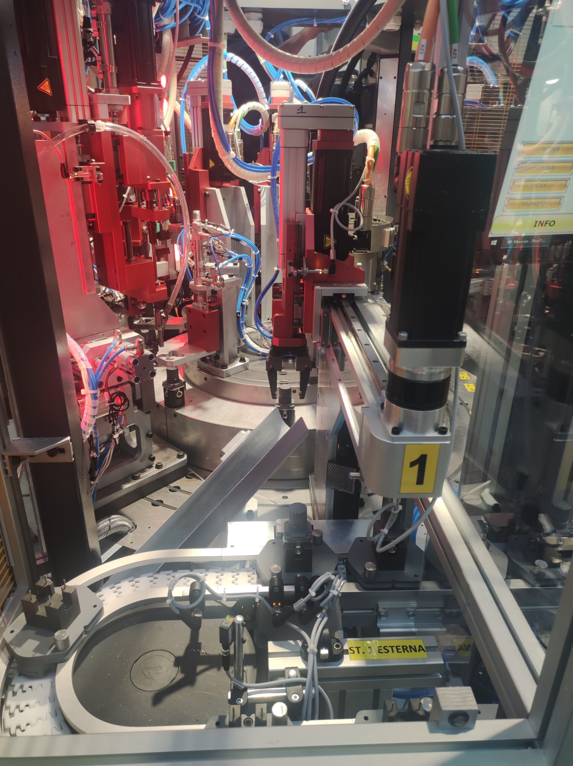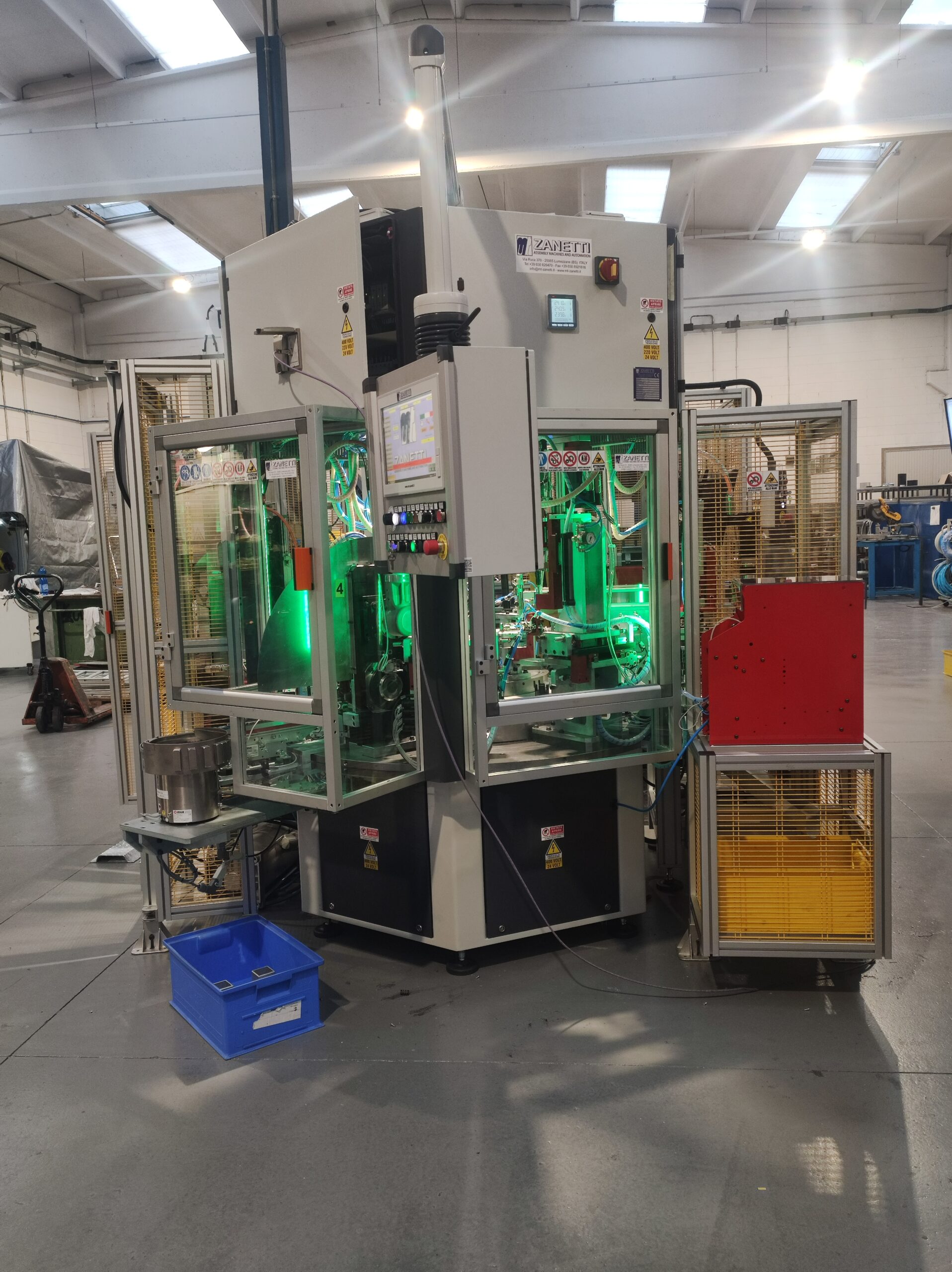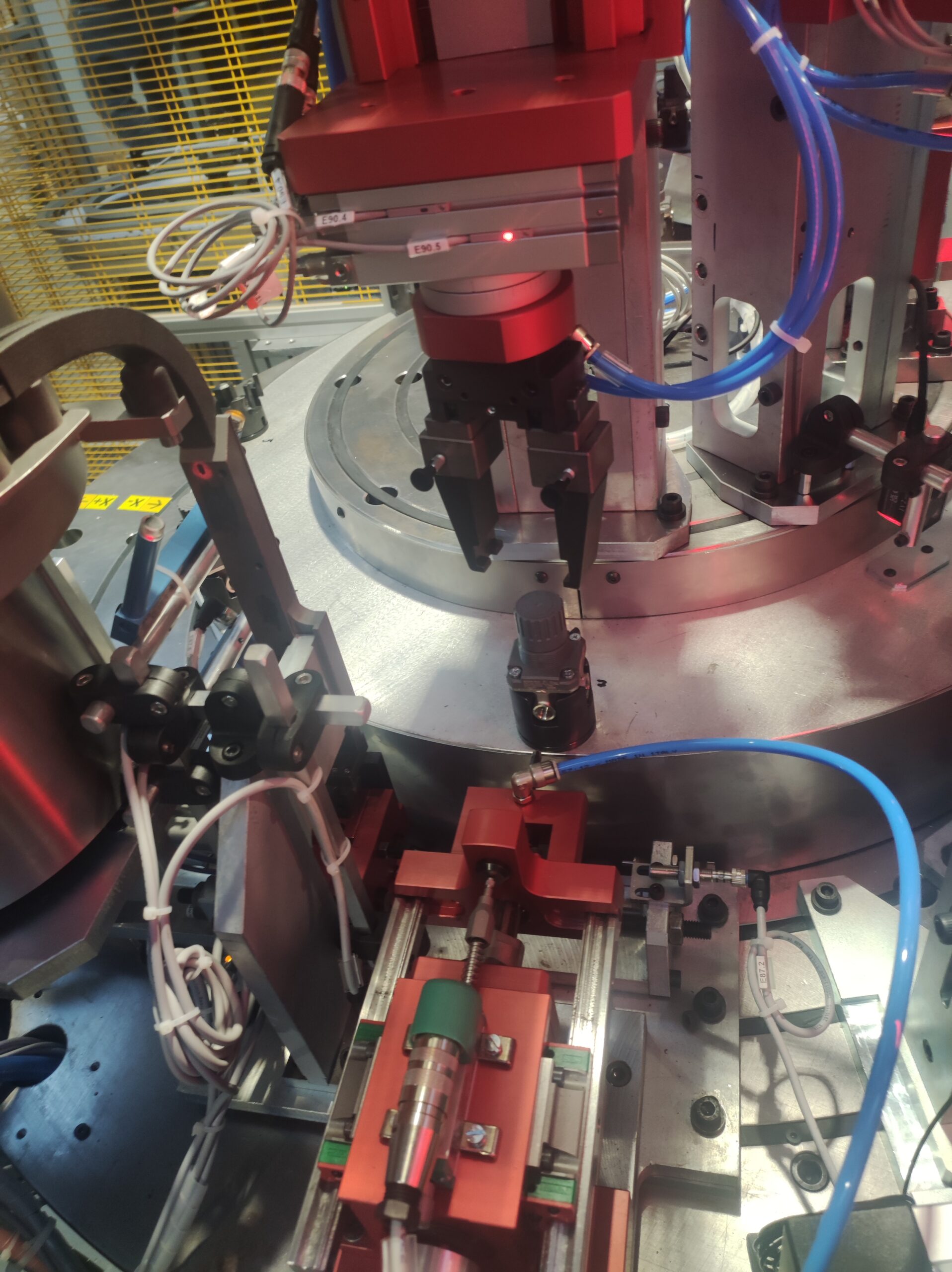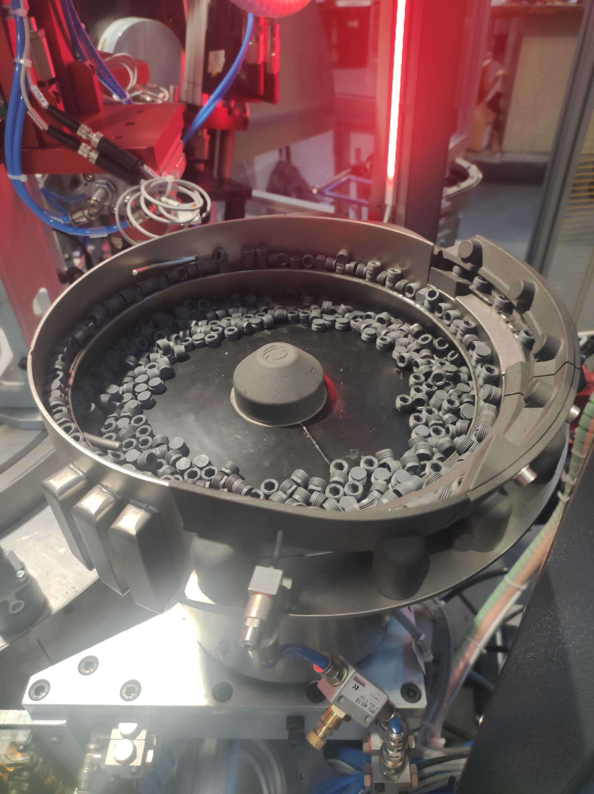 Il corpo del regolatore viene alimentato tramite una linea a pallet precaricata mentre tutti gli altri componenti sono alimentati automaticamente tramite vibratori circolari e rettilinei completi di tramogge in sospensione per dosare e aumentare la capacità di carico. Il prodotto assemblato viene inoltre scaricato dalla tavola rotante, manipolato nelle stazioni di collaudo e marcatura a laser tramite un robot antropomorfo e infine depositato su nastrini motorizzati.