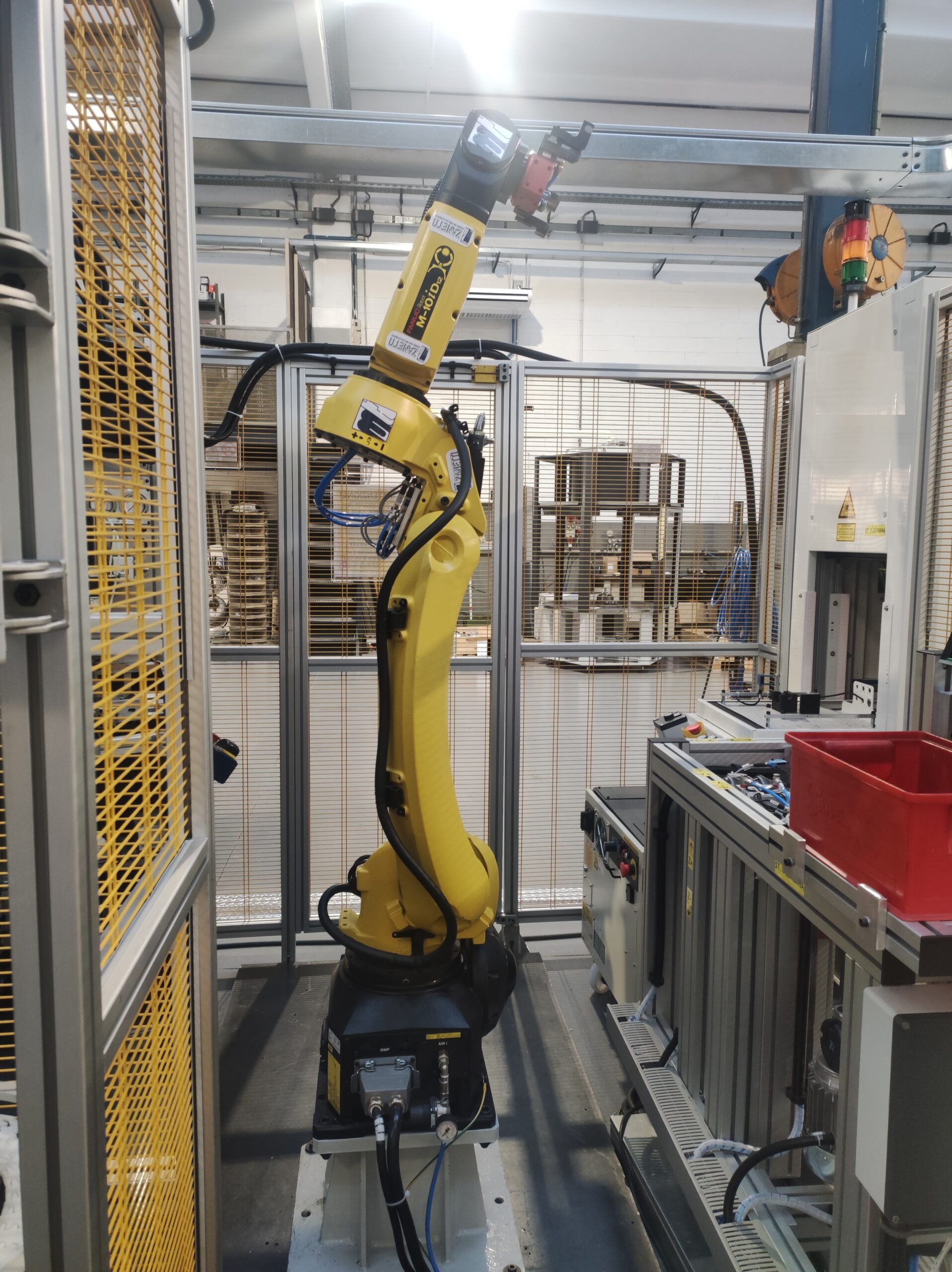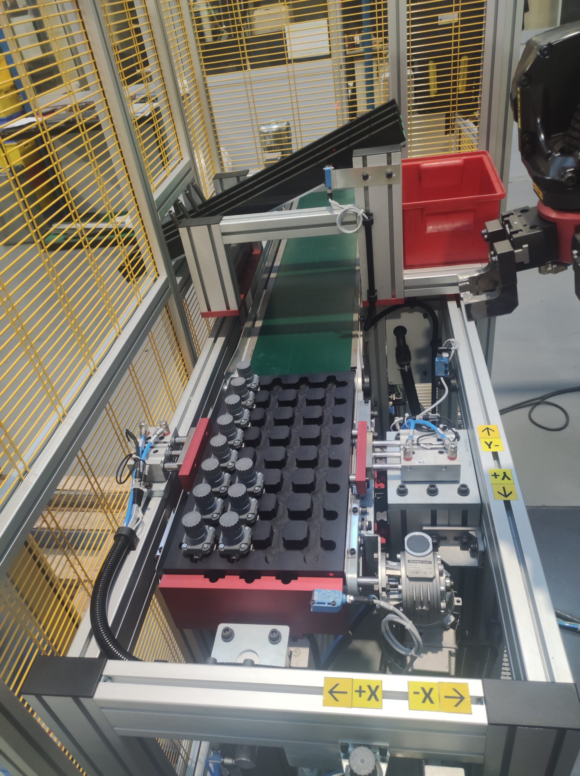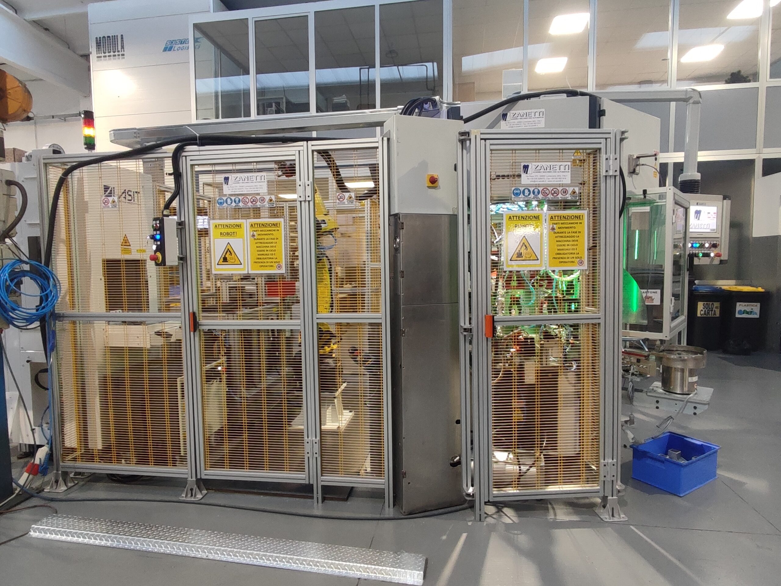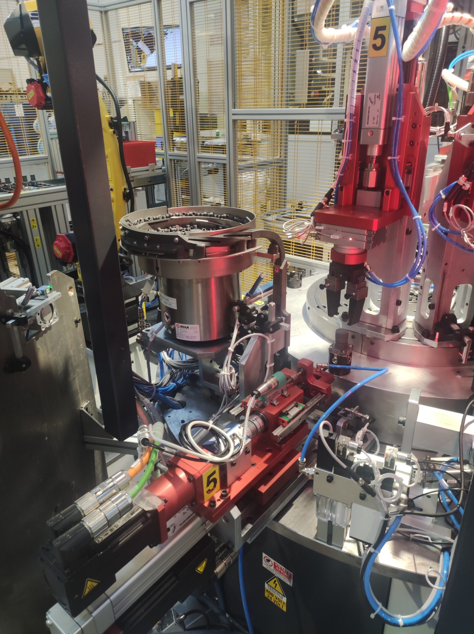 Il corpo del regolatore viene alimentato tramite una linea a pallet precaricata mentre tutti gli altri componenti sono alimentati automaticamente tramite vibratori circolari e rettilinei completi di tramogge in sospensione per dosare e aumentare la capacità di carico. Il prodotto assemblato viene inoltre scaricato dalla tavola rotante, manipolato nelle stazioni di collaudo e marcatura a laser tramite un robot antropomorfo e infine depositato su nastrini motorizzati.