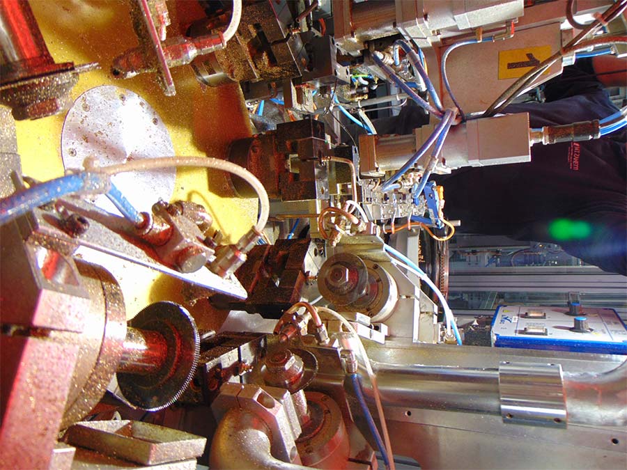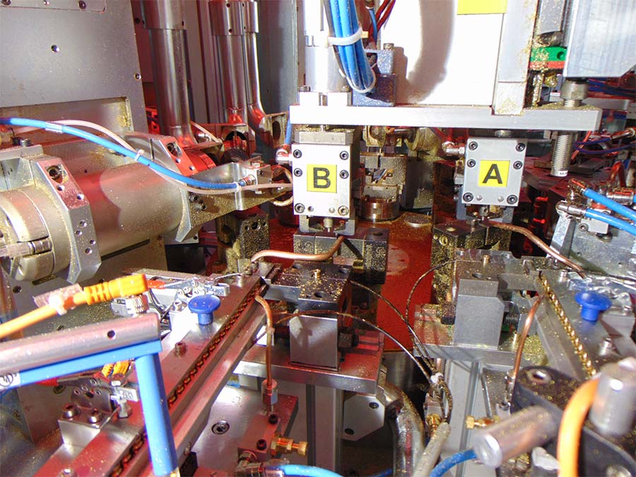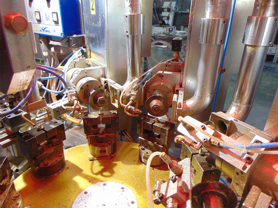 La macchina esegue il taglio contemporaneo e automatico di n.2 pinze per raccordi pneumatici in ottone.