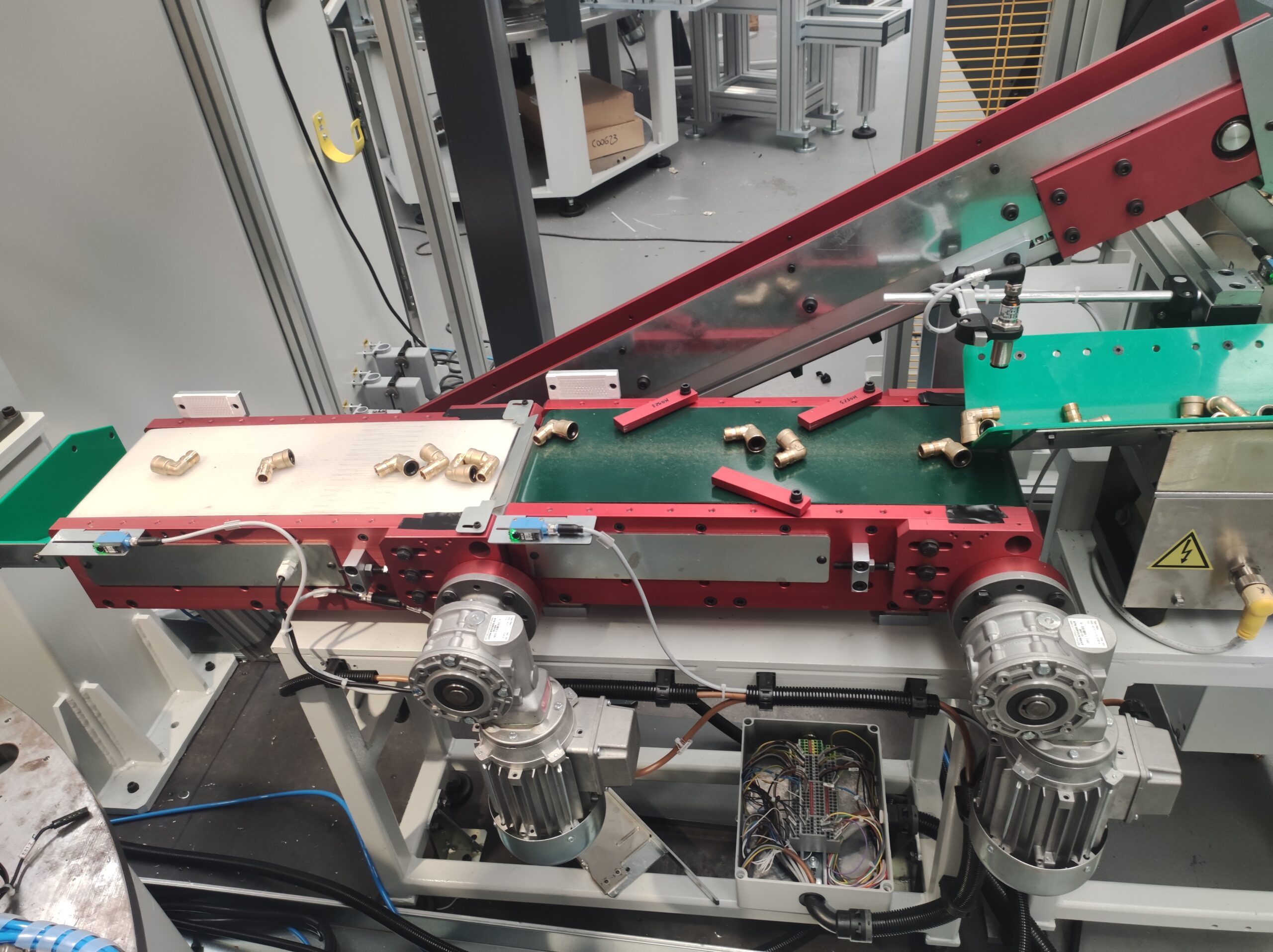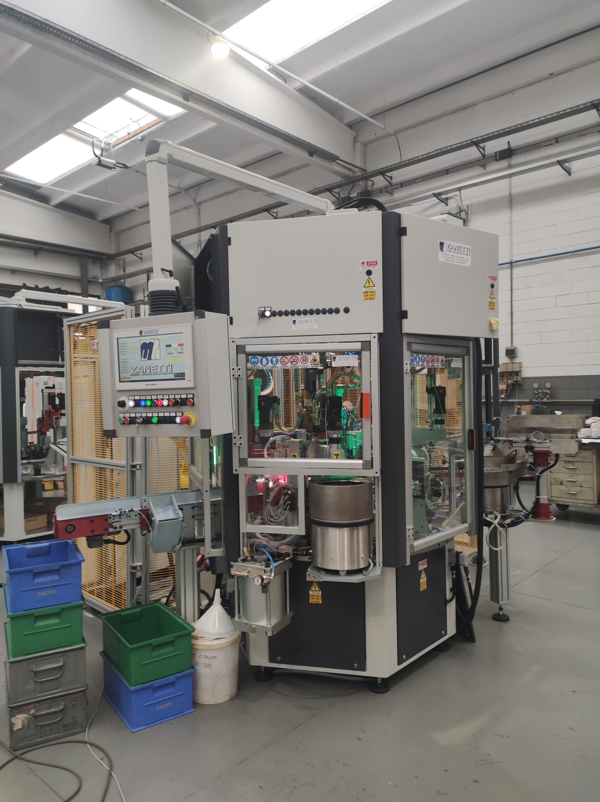 Tutti i componenti sono alimentati automaticamente tramite vibratori circolari e rettilinei completi di tramogge in sospensione per dosare e aumentare la capacità di carico. Il corpo principale è alimentato tramite una sistema a nastri motorizzati e tramoggia in asservimento al robot di presa pezzo.