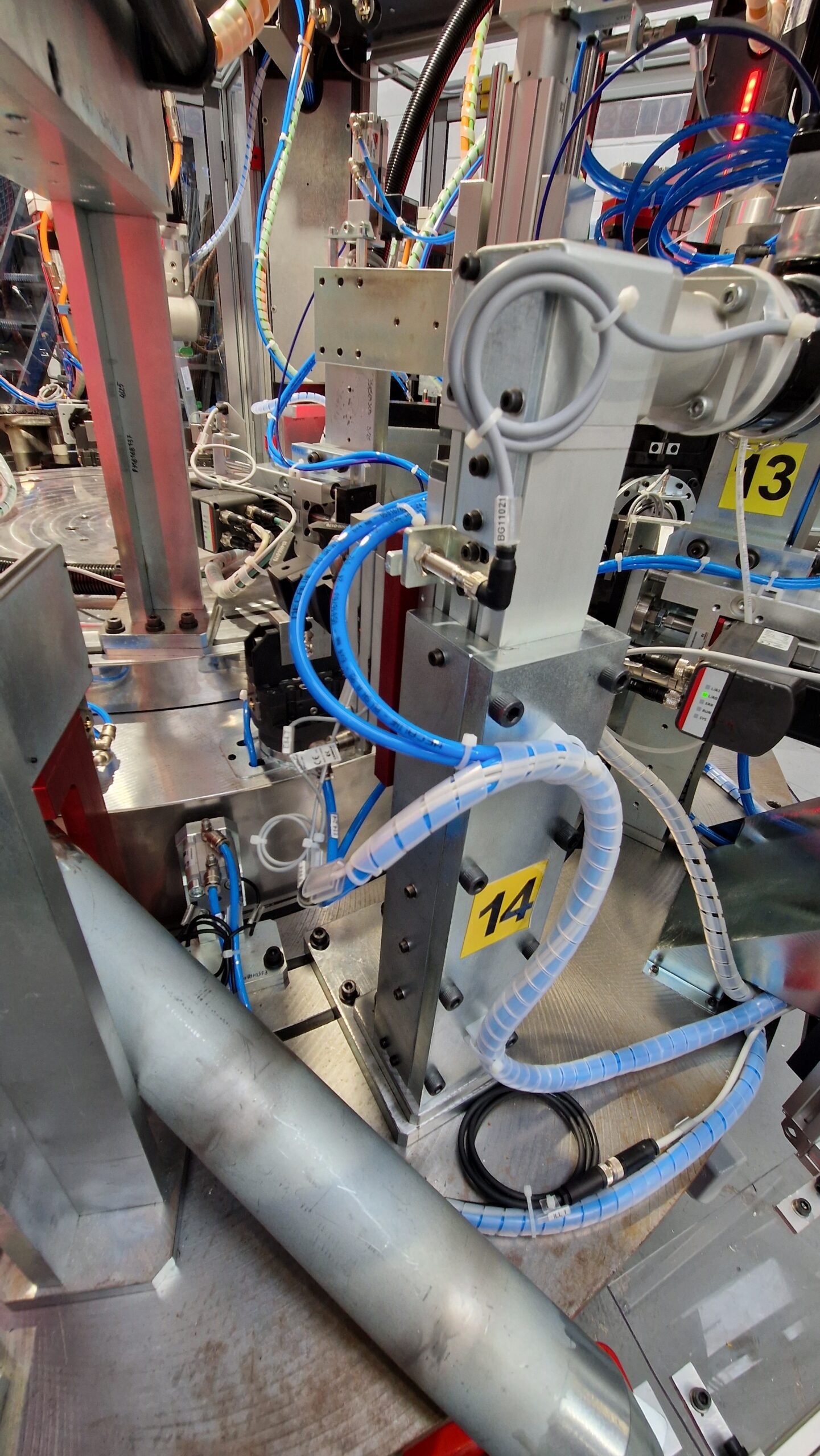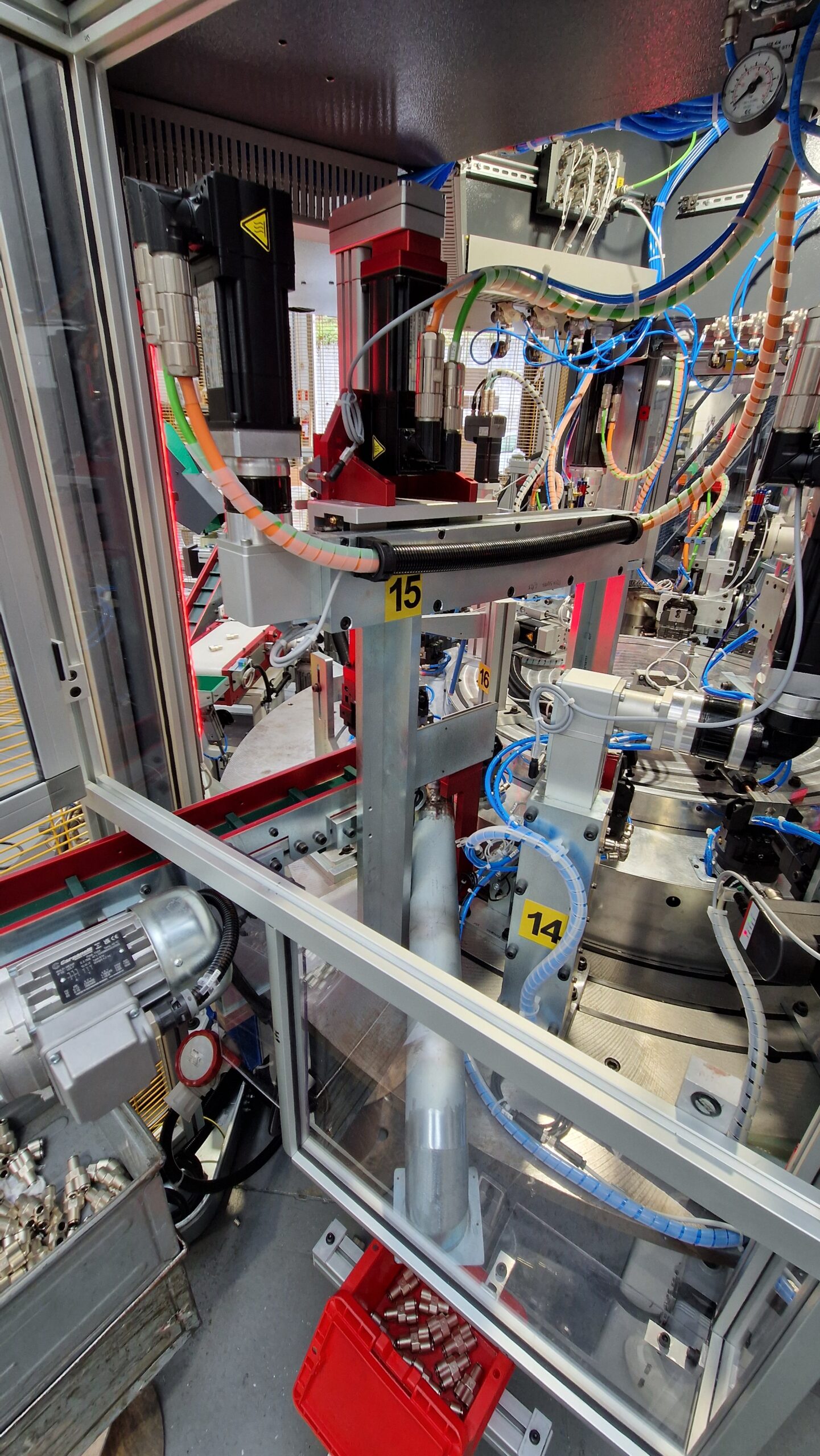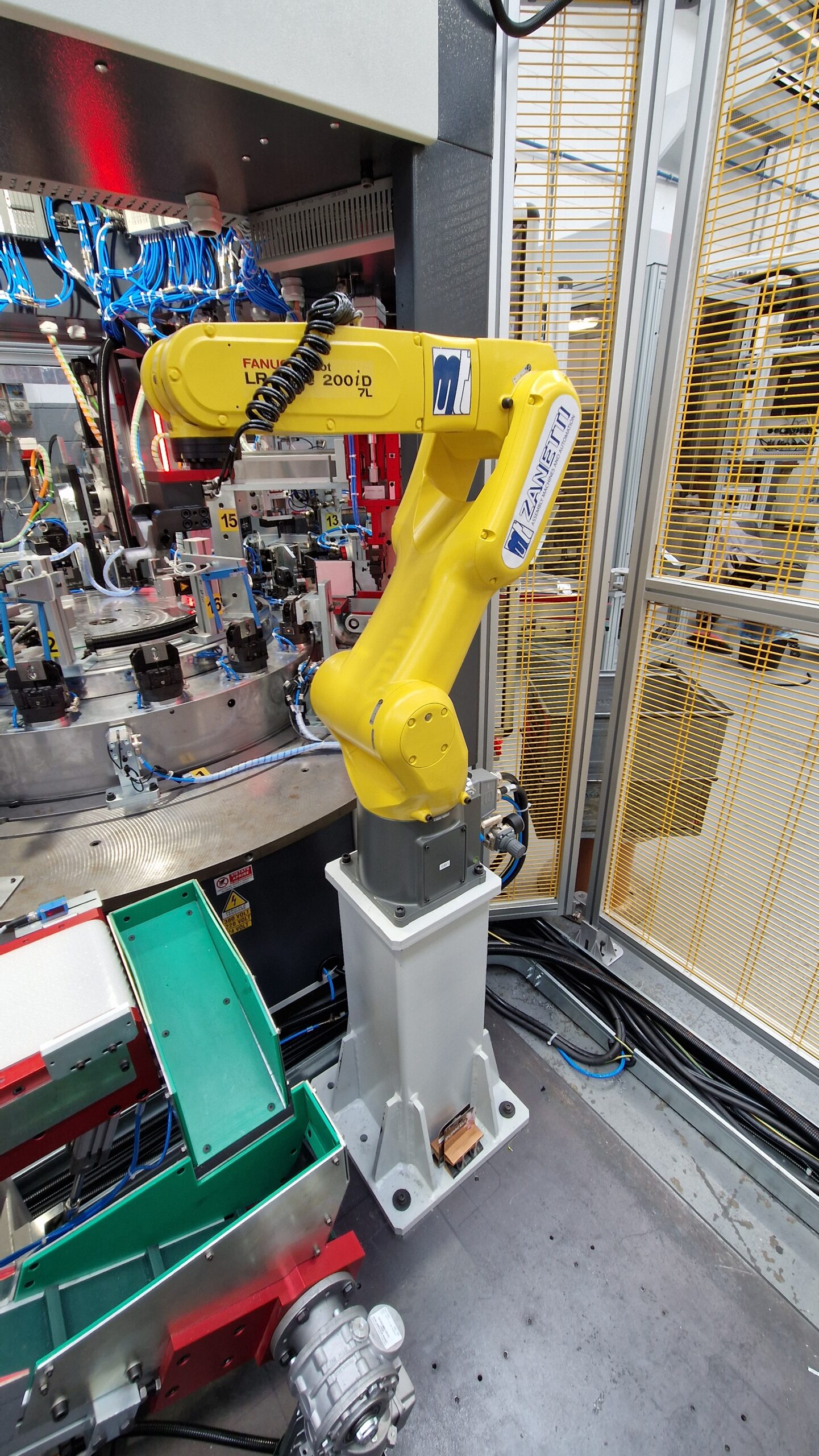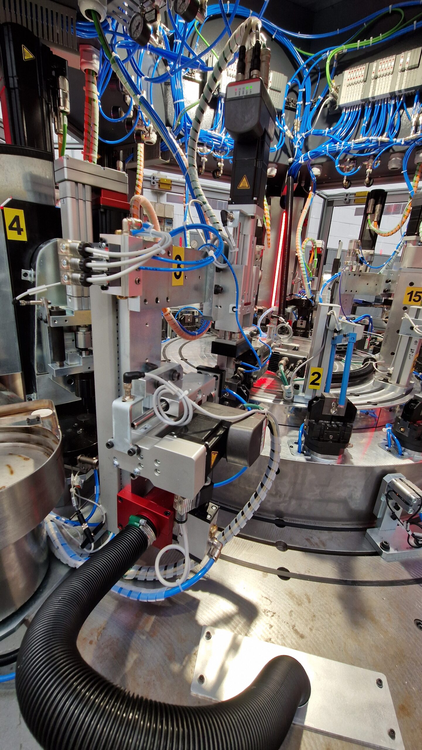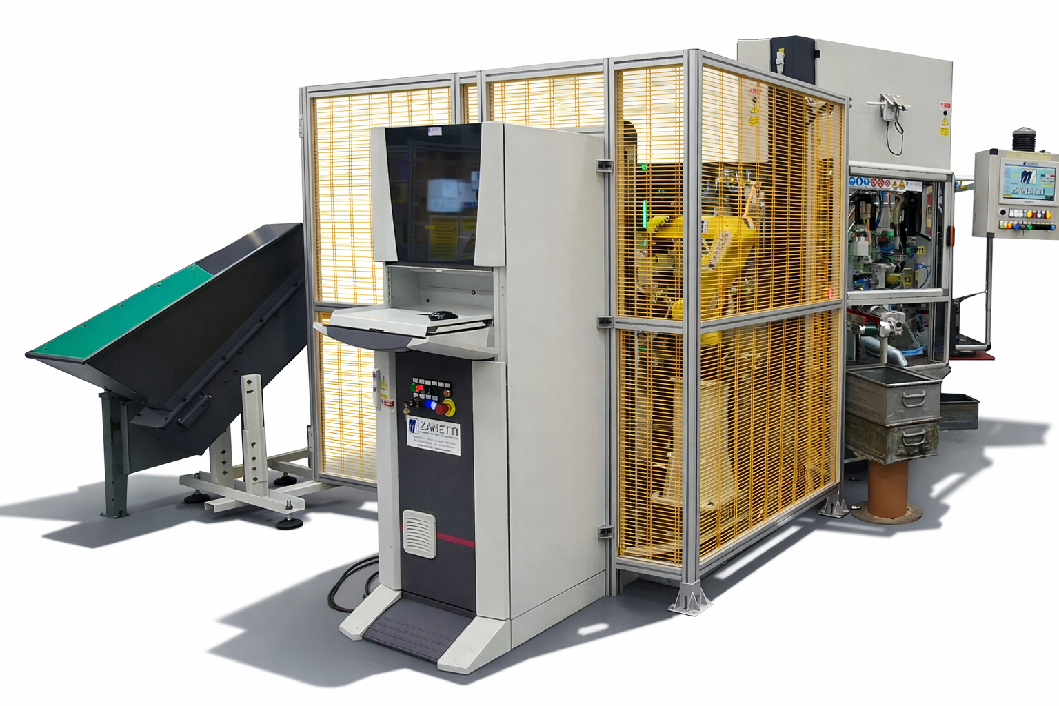 Il corpo del raccordo a Y viene invece alimentato tramite elevatore a tramoggia e nastro motorizzato, in asservimento a un robot di presa pezzo dotato di sistema di visione.
