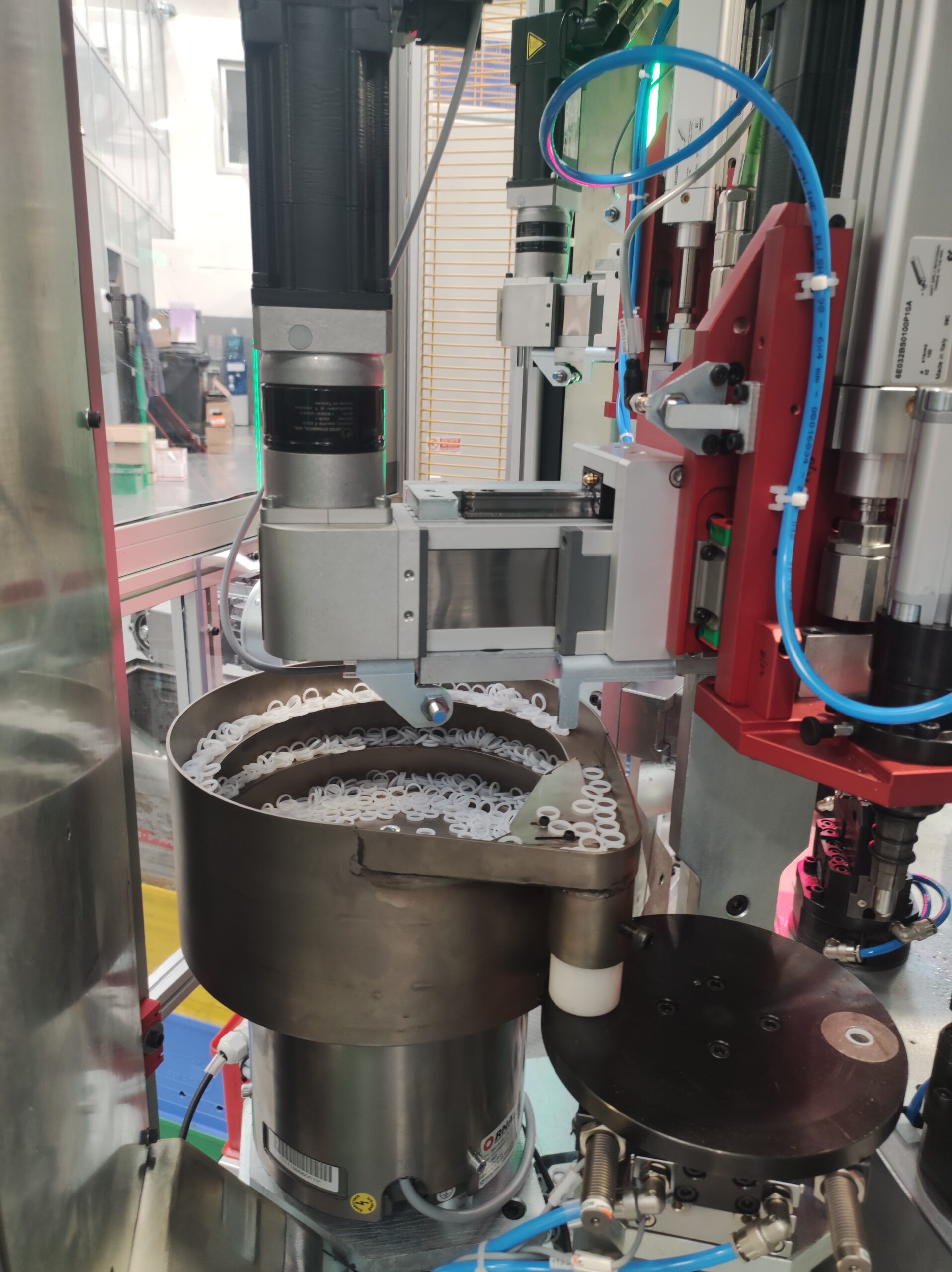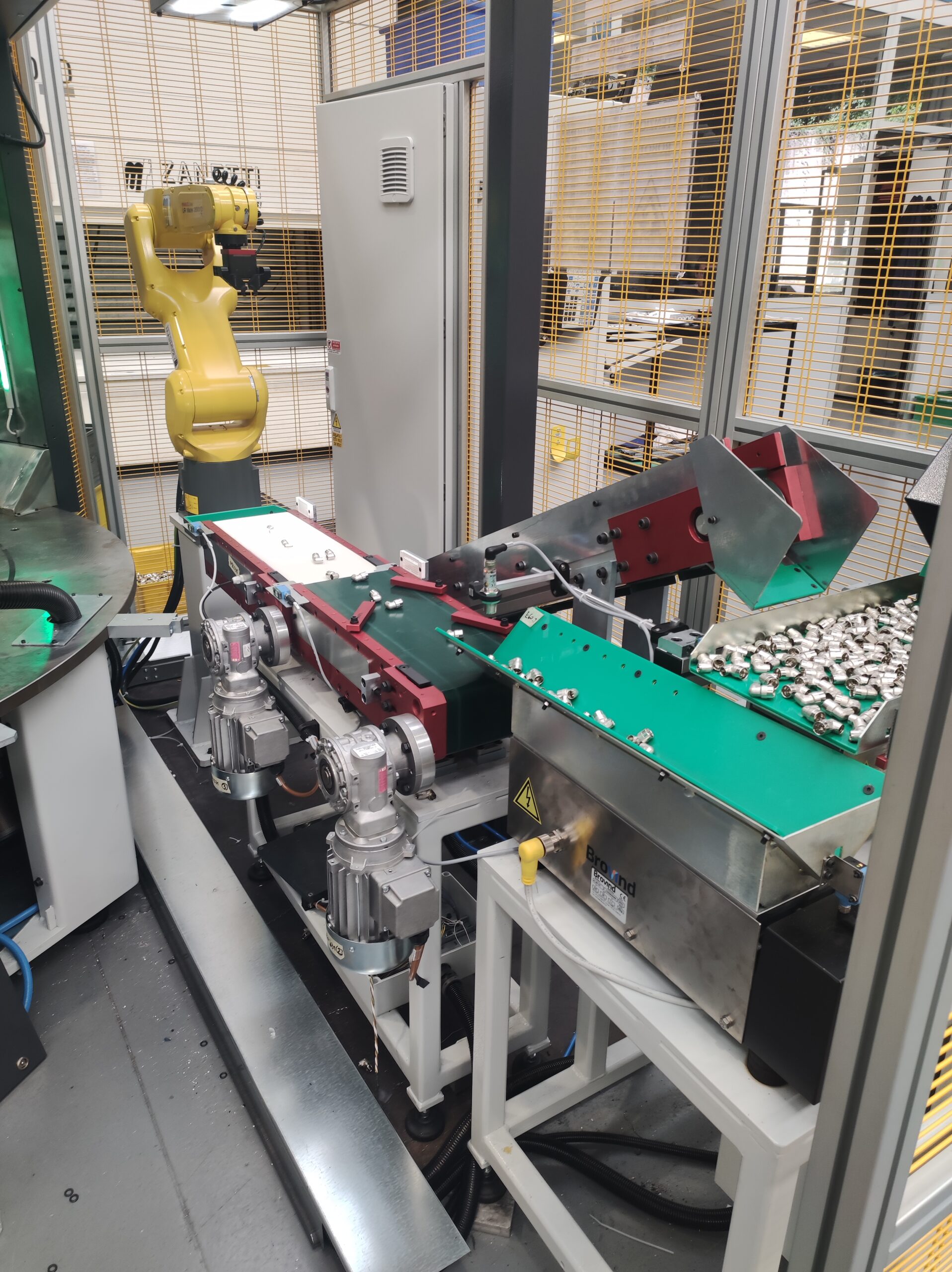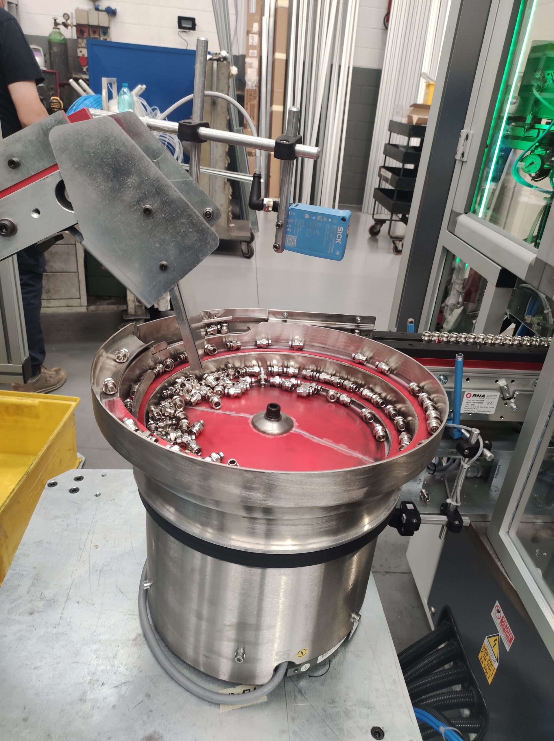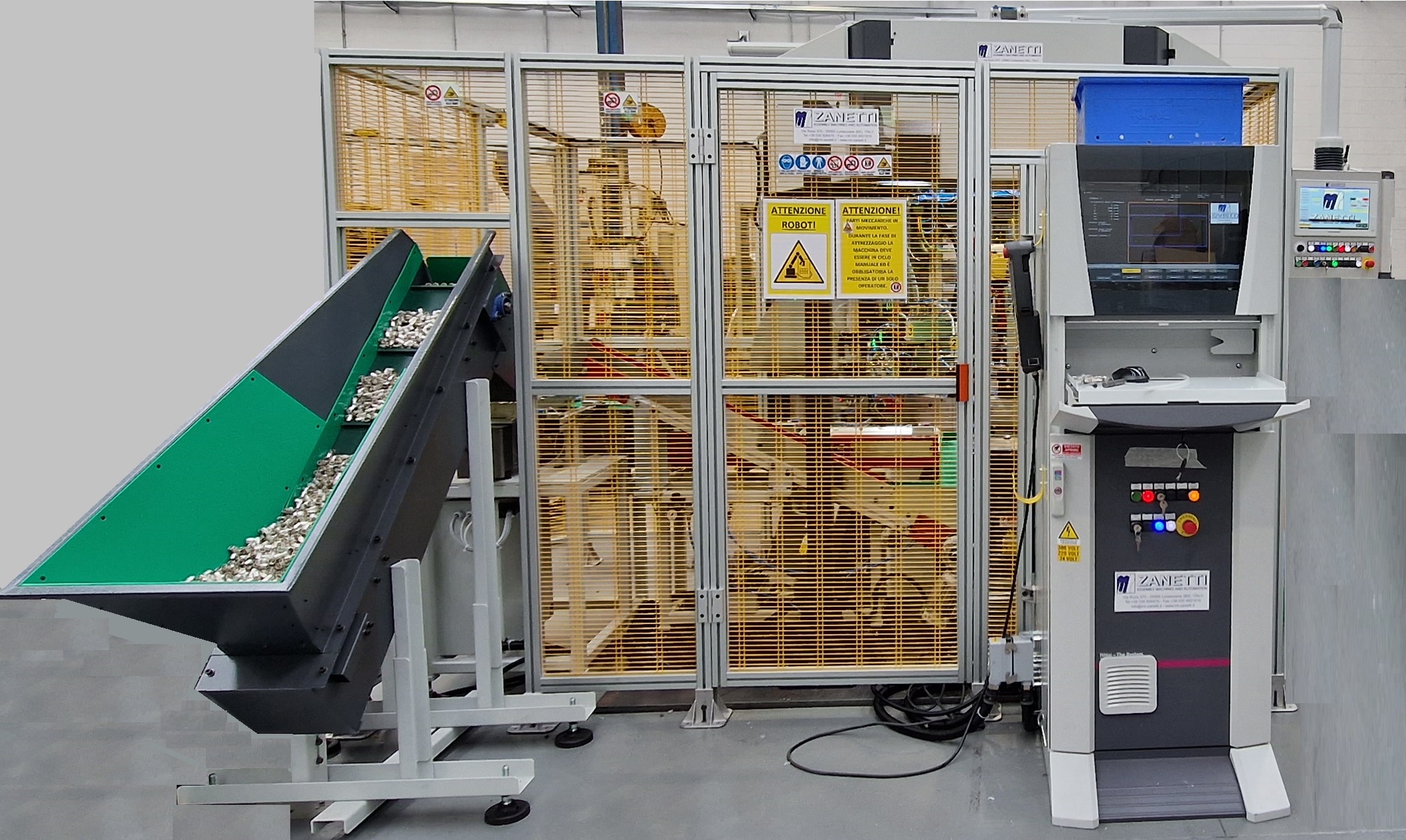 Tutti i componenti sono alimentati automaticamente tramite vibratori circolari e rettilinei completi di tramogge in sospensione per dosare e aumentare la capacità di carico. Il corpo principale è alimentato tramite una sistema a nastri motorizzati e tramoggia in asservimento al robot di presa pezzo.