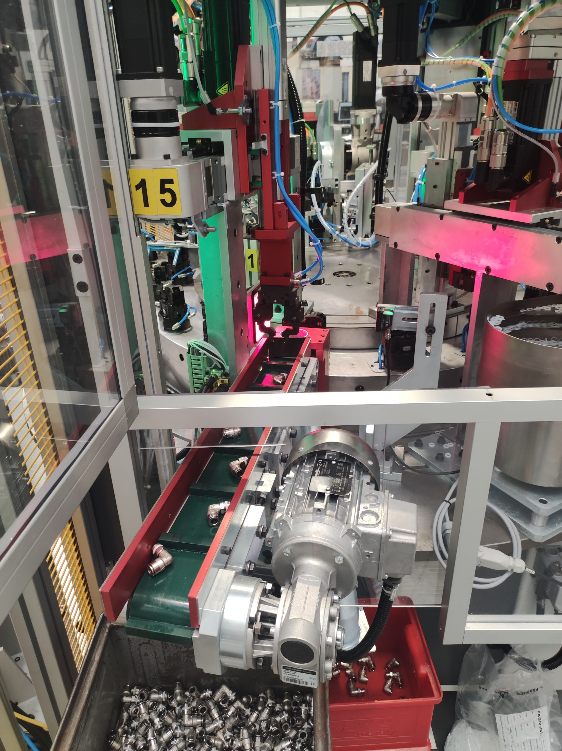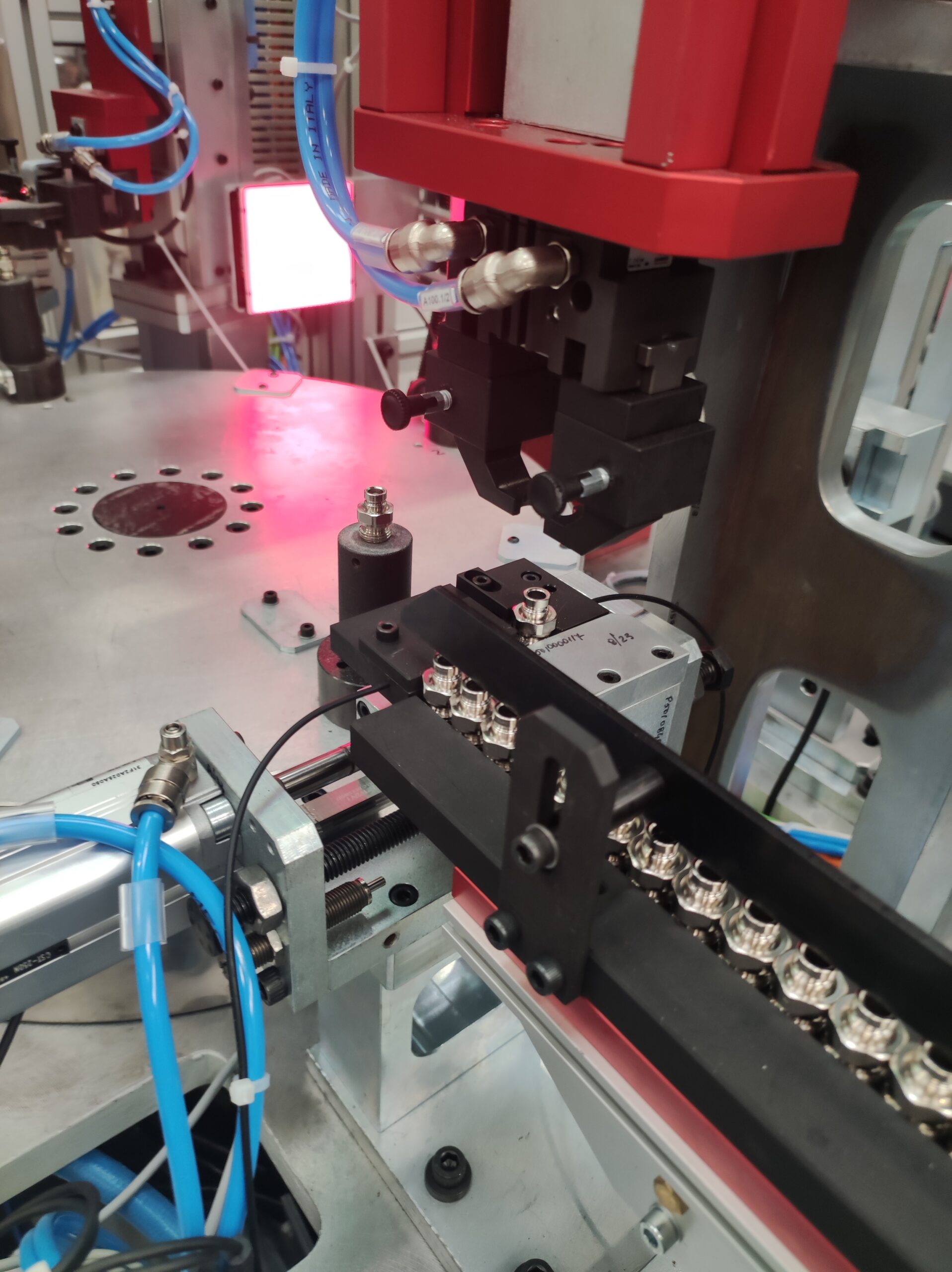 La macchina esegue il montaggio automatico dei raccordi pneumatici super rapidi con una serie di controlli di presenza e di tenuta effettuati durante ogni fase di montaggio.