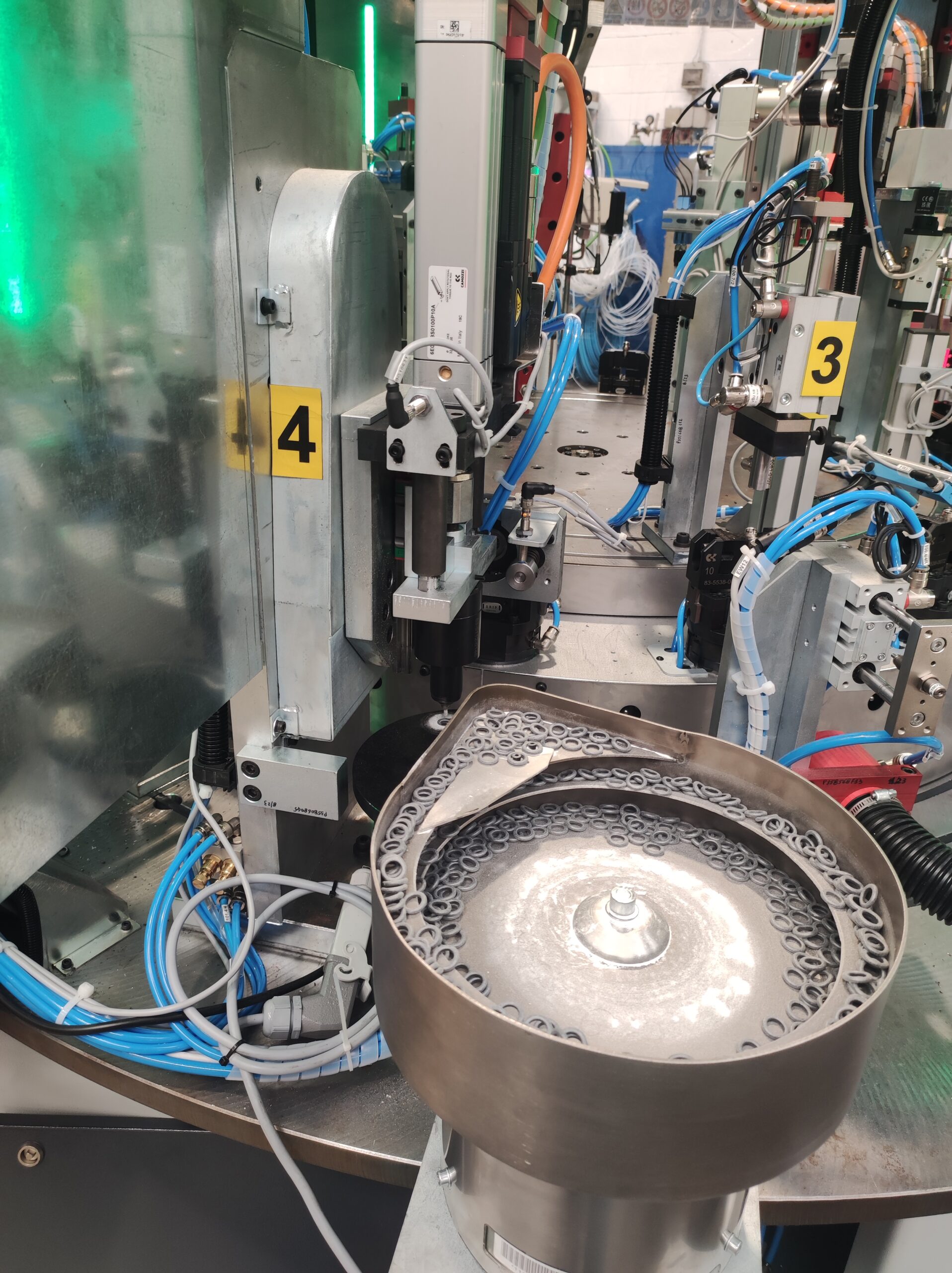 Questa macchina è inoltre dotata di un’appendice esterna per il premontaggio del componente girevole costituita da una tavola rotante a 4 divisioni e collegata direttamente alla macchina principale tramite nastrini motorizzati.