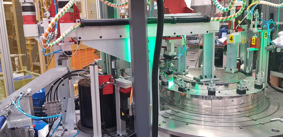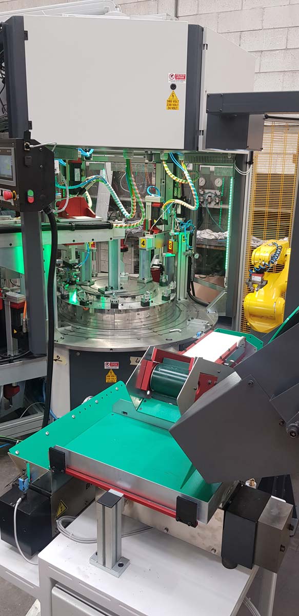 È costituita da un basamento esagonale, da una tavola rotante servo controllata a CN programmabile elettronicamente tramite pannello di comando Touch Screen, da un disco fisso centrale e da un disco rotante esterno completo di posaggi per il posizionamento dei pezzi.